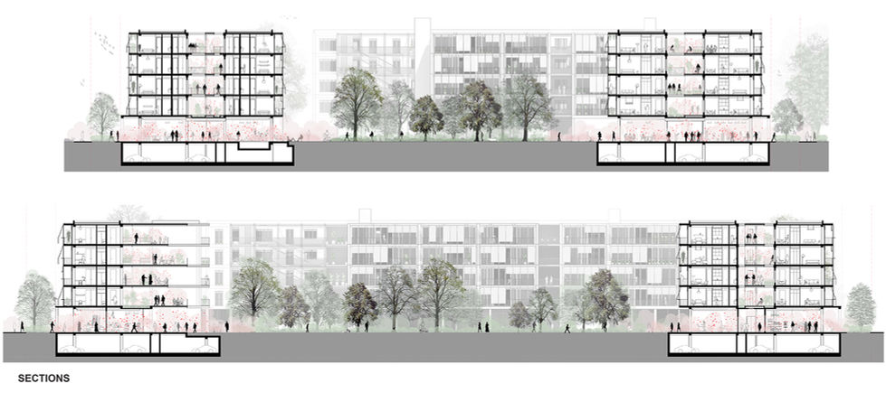 The residential units are offered in six typologies, ranging from studios to three-bedroom apartments, accommodating a diverse group of users. Linear buildings, based on an 8 m × 8 m concrete structural grid, incorporate apartment units designed around a 4 m module, enabling flexible layouts and easy reconfiguration.